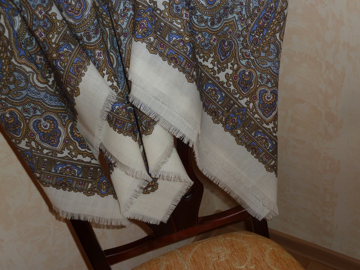Где-то уже писала, что хотела купить Ситцевый край с красной каймой, а случился с темно-бордовой. Не нравился с такой. Я отрезала кайму вообще. Подшила руликом вручную(машинка была вне зоны доступа)-получилась этакая шерстяная косынка- павловопосадскости-ноль, но ничего страшного. Единственно-слишком серый фон этого платочка, люблю посветлее, цвета сливок.