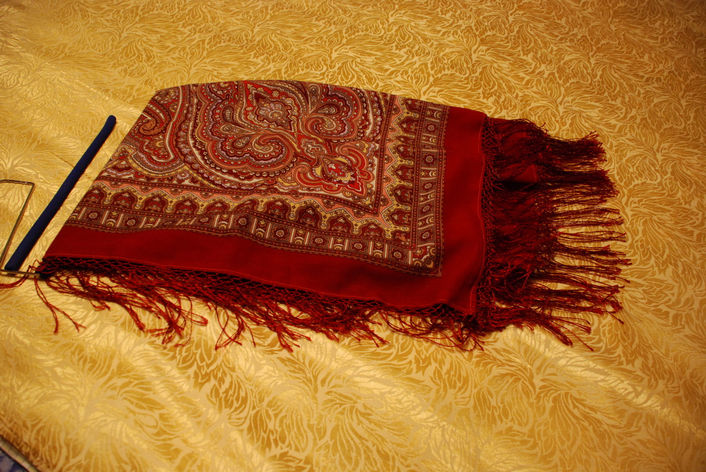 В принципе, против шерстяной ничего не имею, можно и шерсть, но чтобы красиво смотрелось. "За" - полностью подходящий цвет старой бахромы. "Против" - шаль шикарная, такое впечатление, что просится к ней шелковая бахрома.