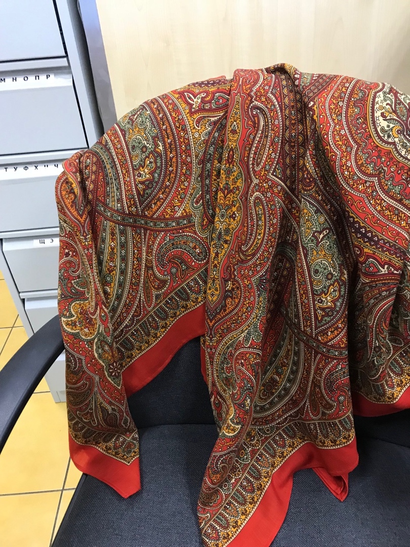 Моей приятельнице очень нравился платочек Край сандала.Но по разным причинам,не удавалось его приобрести.Приехала она ко мне и попросила примерить шарфик Сандаловые острова.Он был на замечательной мягкой и шелковистой ткани.Крутила она его,вертела,маловато будет)И решила попробовать сшить два шарфика,и посмотреть что из этого получится.А получилось очень хорошо.Практически платок,но с купонным рисунком на две стороны,как у палантина.Результатом она очень довольна.