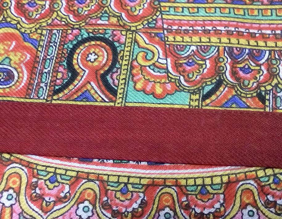 Лоскут нестандартного "припылённого"цвета(второй лоскут есть в продаже),по одной стороне срезана кайма в край рисунка.По трём сторонам кайма шириной от 9см до 12см. Срезана кайма по долевой стороне.У второго долевика ширина 9см.Разделила пополам и срезала лентой.Пришила к срезаной стороне.Итог на фото.