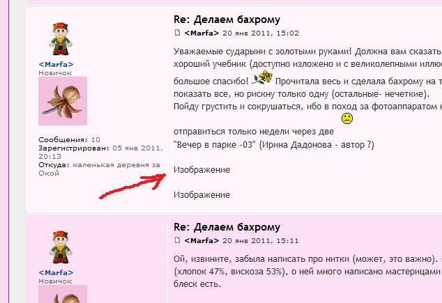 Прошу прощения, но я не вижу Ваших изображений...<Marfa> писал(а):Уважаемые сударыни с золотыми руками! Должна вам сказать, что вы написали очень