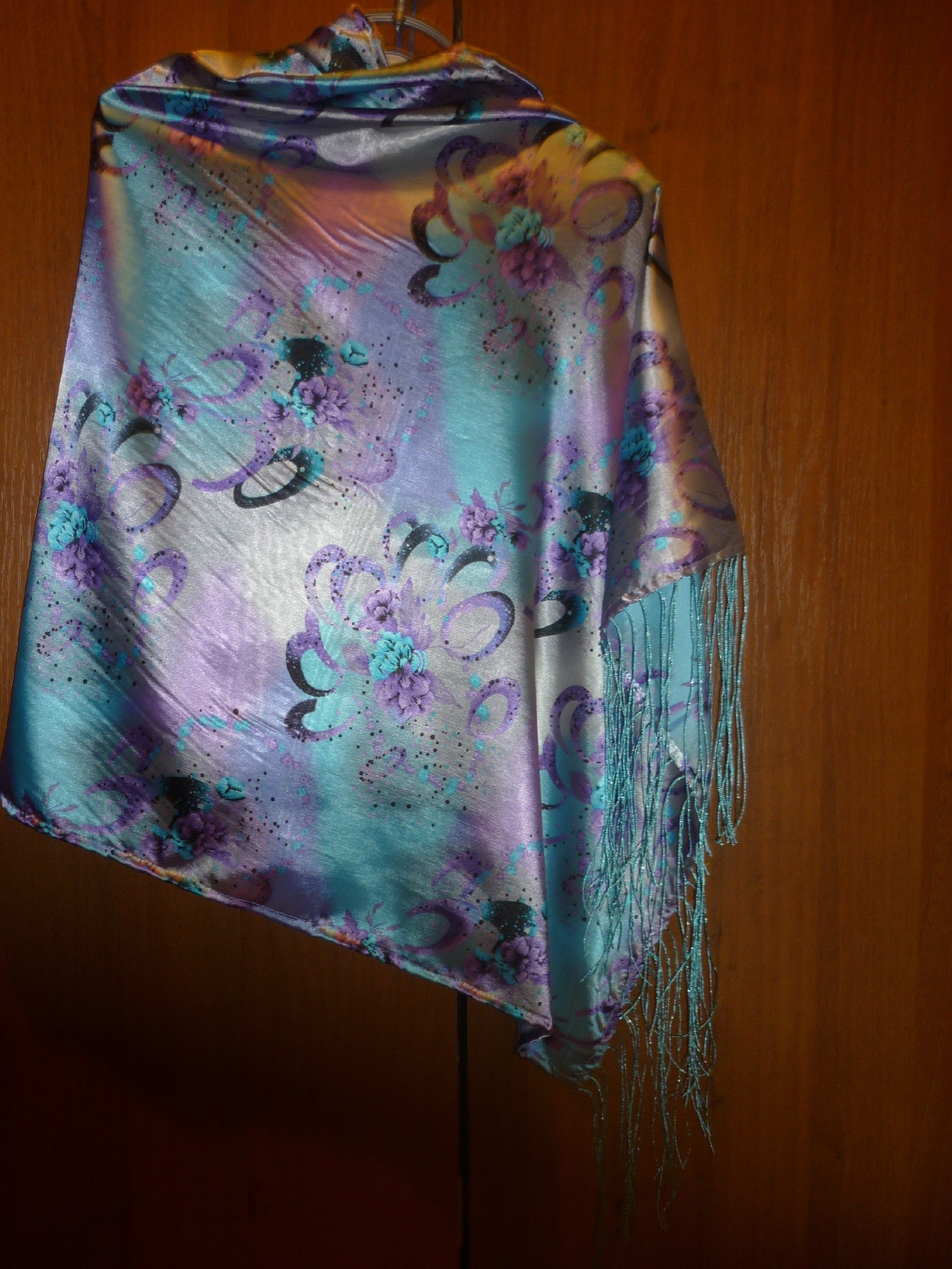 заразившись небезызвестным всем нам вирусом, на днях мне вдруг пришла интересная идея. а почему бы самой не смастерить шелковую шаль? тем более сейчас в магазинах такой выбор! В нашей Калининградской области конкуренции нет, один крупный монополист специализируется на тканях и шторах , и натуральный шелк стоит от 1930 руб за метр(при ширине 145 см), то для начала я решила попробовать на искусственном шелке и смастерила палантин.
