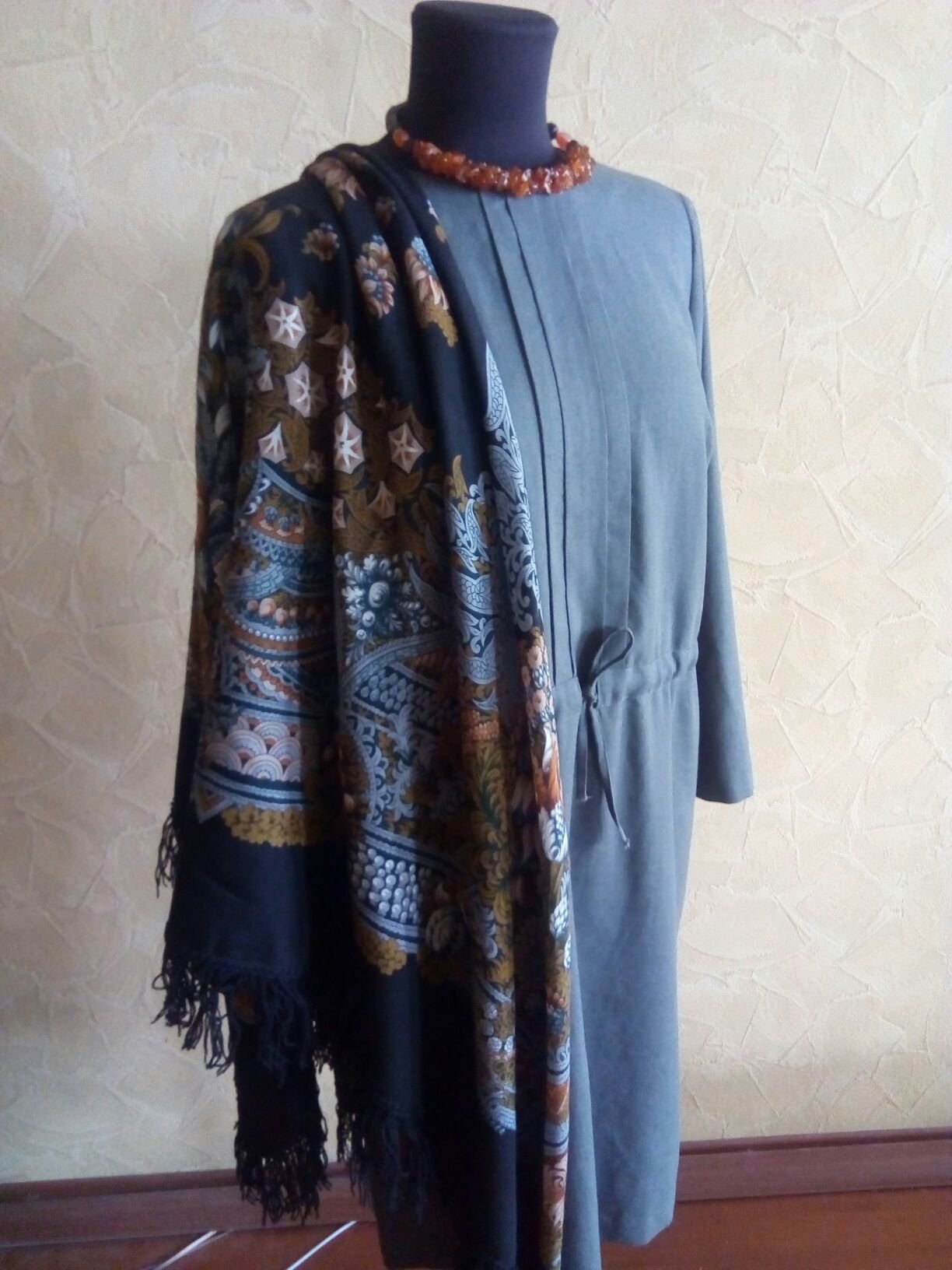 Сшила базовое платье. В кои веки себе и нехарактерно серого цвета. С Бархатной ночью 18 хорошо. Оказалось, не так просто платок подобрать, серый имеет массу оттенков.)