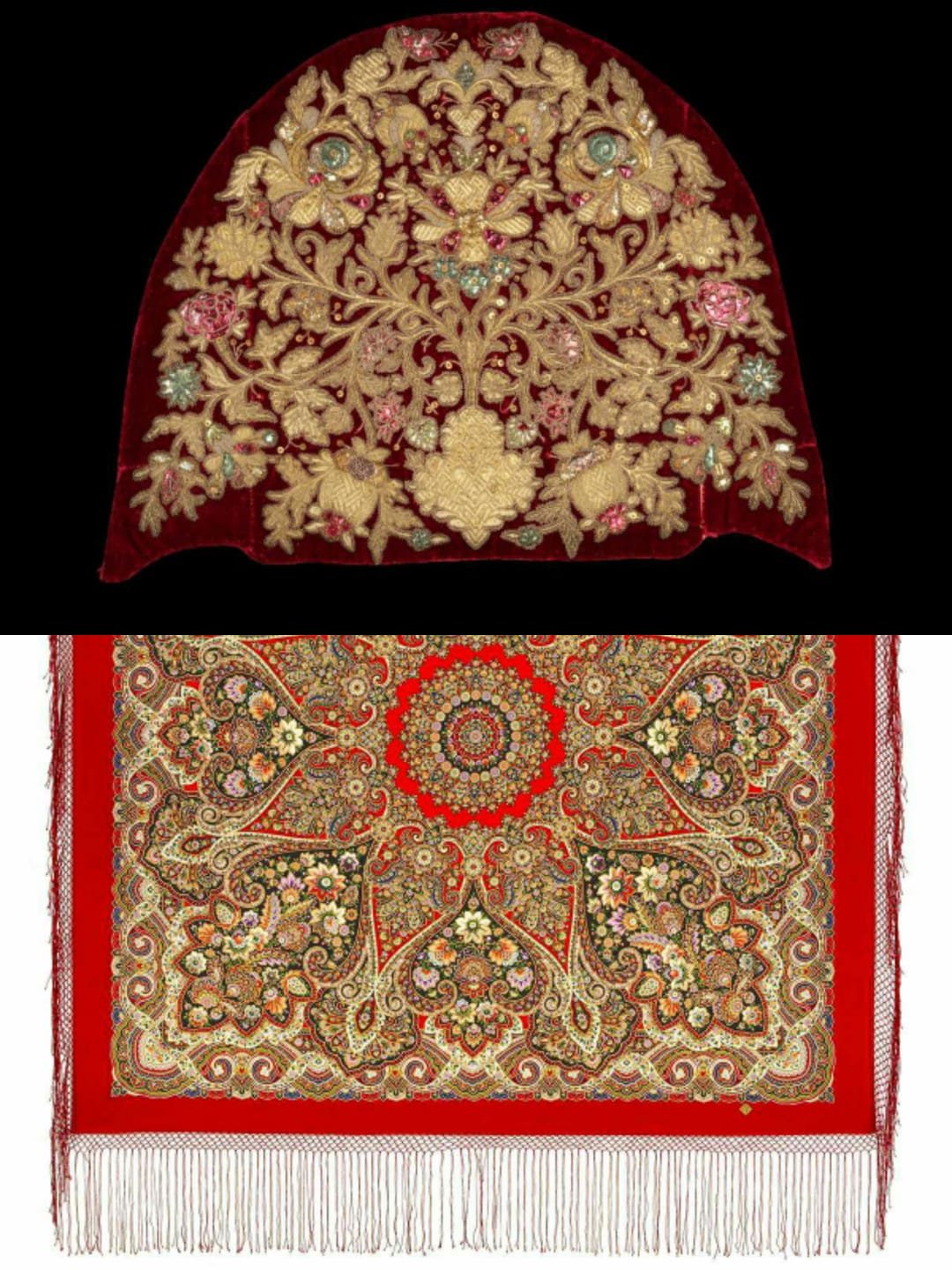 Рисуя шаль,можно ведь опереться на традицию золотошвейных - вышитых шалей,платков,головных уборов.