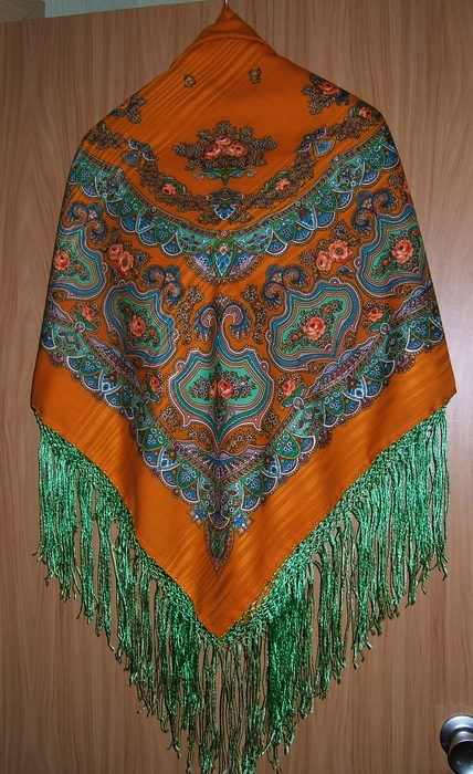 Решила обахромить. Искала по всей Москве идентичный оранжевый. Сколько я с этим платком пробежала по магазинам))) "И ни сащщщитаишь!".. в итоге в фирменном магазине Семновской фабрики мое терпение лопнуло и я куила ярко-зеленый.