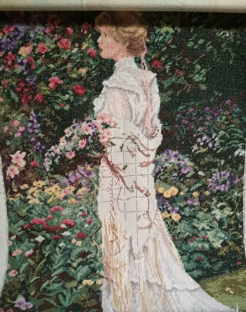На 32 каунте ширина 42 см. На 36ct смотрелся бы тоже отлично, и на 40. Нитки не секционного .Ключ в DMC, шью по ключу. Цвета припылённые, смотрятся выгоревшими. У меня был выбор из двух основ - простой однотонной и с разводами ручного окрашивания. Однотонная на мой взгляд лучше подошла, действительно иллюзия винтажного выцветшего художесивенного листка. Видела отшивы на льне ручного. Интересно, но всё равно выбрала бы однотонный либо может с лёгкой имитацией старой бумаги.
