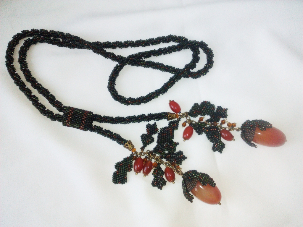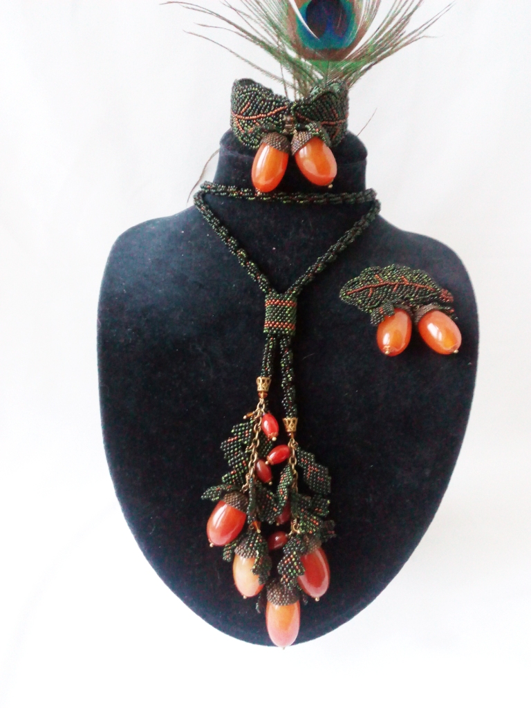 Честно говоря, когда меня попросили сделать колье с жёлудями, из больших бусин сердолика, я была сильно озадачена. Просто не представляла, как я это должно выглядеть. В общем в течении пары лет мне периодически напоминалось об этом желании. Решила попробовать и в июне этого года, эти бусины, в количестве 15 штук ко мне прибыли. Я честно говоря прибалдела, когда их увидела. они действительно большие (до 3,5 см) и достаточно тяжелые. Регулярно, раза 2-3 в месяц, я доставала эту связку и тупо смотрела на них, в течении пары дней, ни одной идеи не появлялось. Наконец решила, пока не сделаю, ничего другого делать не буду. Это было 1 ноября :lol: Ну и 1 го декабря, комплект был готов ^Y . До сих пор не верю, что я его сделала. (Кликните, чтобы почитать, что спрятано под катом)...