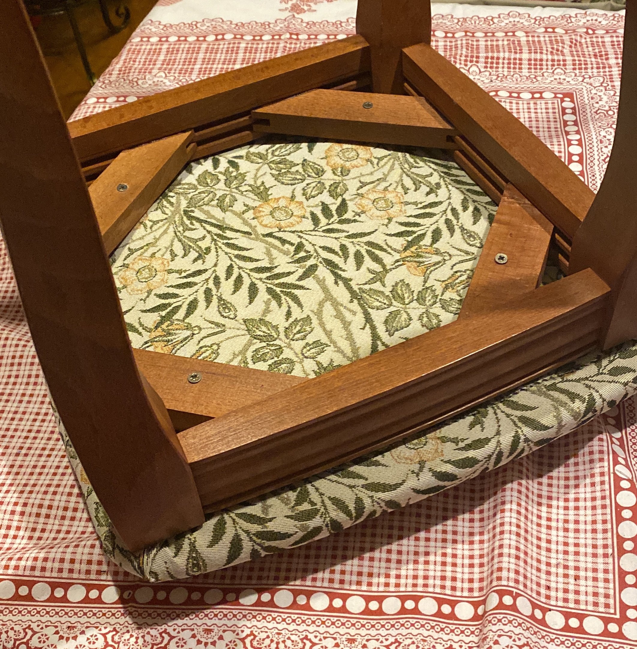 У меня новый опыт "рукоделия"--обтягивала табуретку. Сохранилась пара табуреток--старые,( куплены в СССР :D ), дерево еще сносно выглядит. Они "раритетные"--в том плане, что ими никто не пользуется. Как было "до" --страшно показывать. Оказалось мало скоб --пришлось заложить складки. Вроде аккуратно получилось. Для первого раза --результат своих усилий понравился! Хвалюсь!