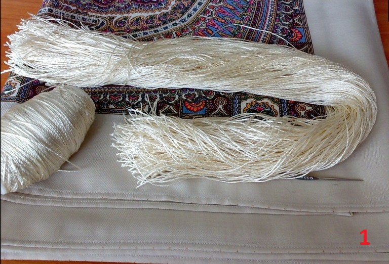 Уходит 1 катушка Сапфира и метров 80, со второй катушки. Для шаблона использую старую детскую книгу, нить получается 60 см длиной. Бахрому делаю в 2 нити.