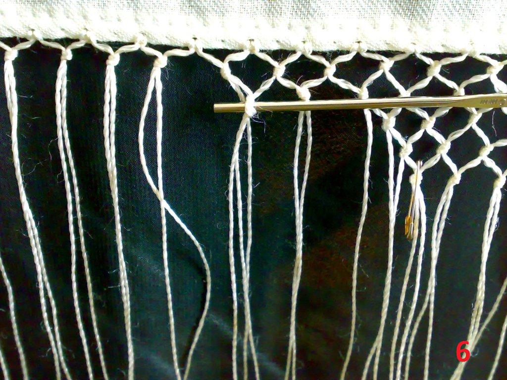 Если остаются проколы от старой бахромы (фото 2), то ничего страшного, на шерстяном платке или шали, после глажки их не будет видно. Когда нанизываю пряди на бахрому, то проколы делаю соответственно со стороны разметки, с изнанки. Прокалываю крючком толщиной 0,50 мм. Узелки вяжу тоже с помощью крючка, завязала руками узелок и обратной стороной крючка подтягиваю узел вверх (фото 5,6). Главное, хорошо завязать первый ряд . Следите, что бы не стягивался край. Узелки должны провисать, был вершиной треугольника.
