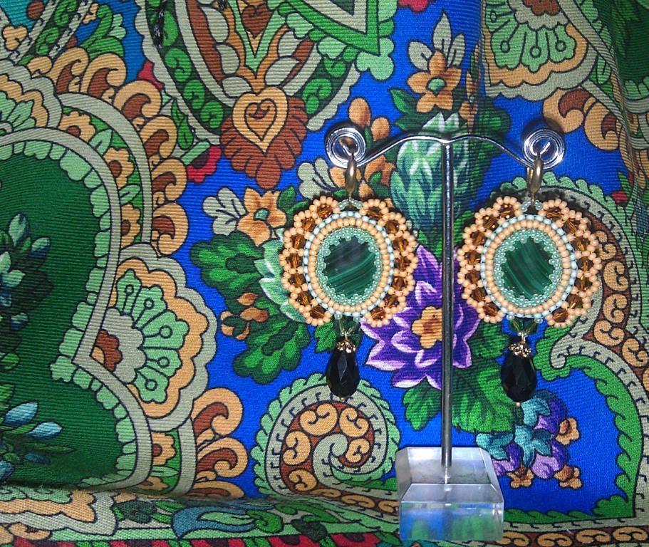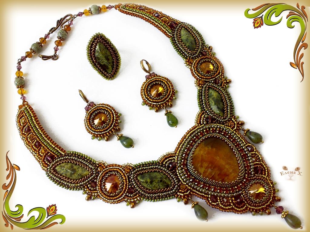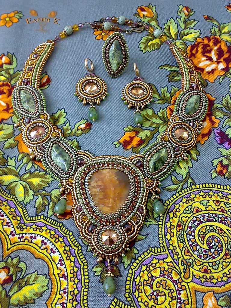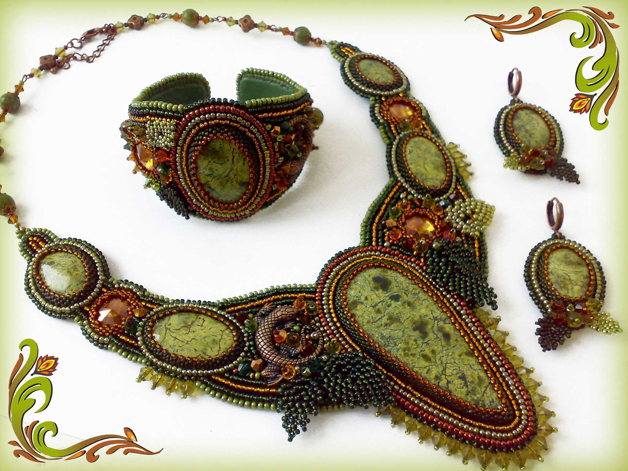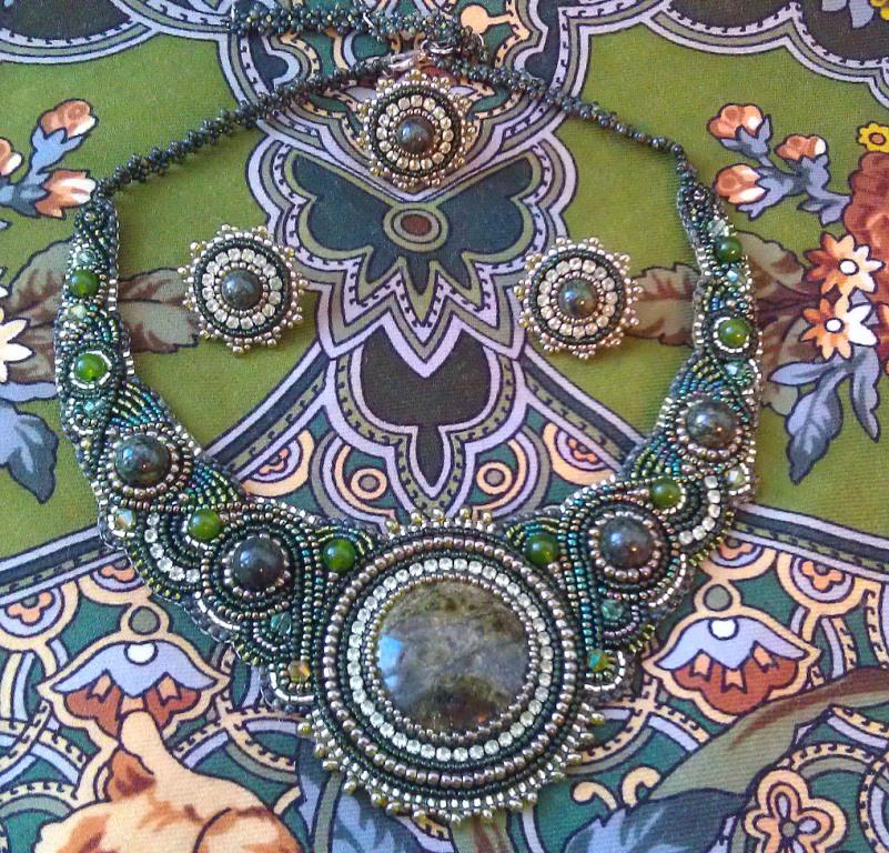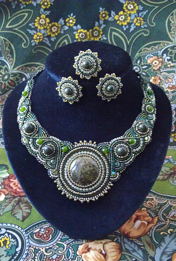 Этот комплект был сделан еще в феврале, под мои любимые Качели. Но как оказалось, комплект так же подошел и к шали У самовара 1 (правда этой шалочки уже нет). Вставки из уральского змеевика, Волжского симбирцита и нефрита.
