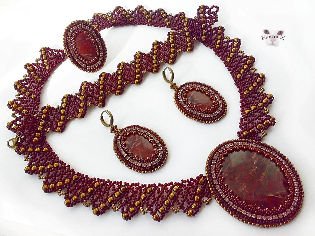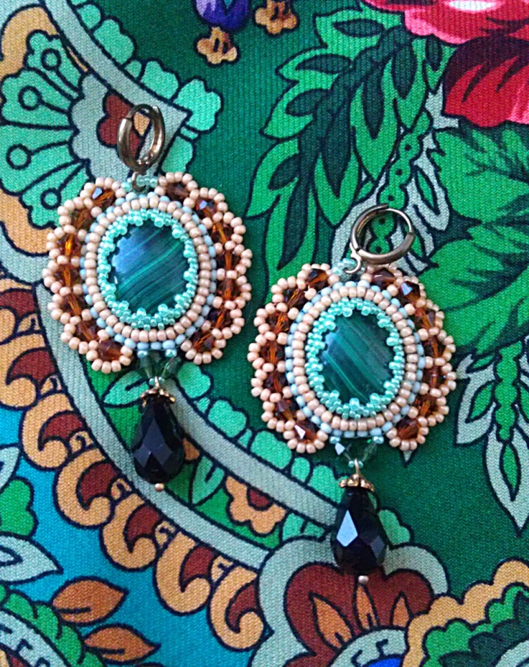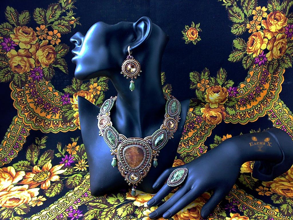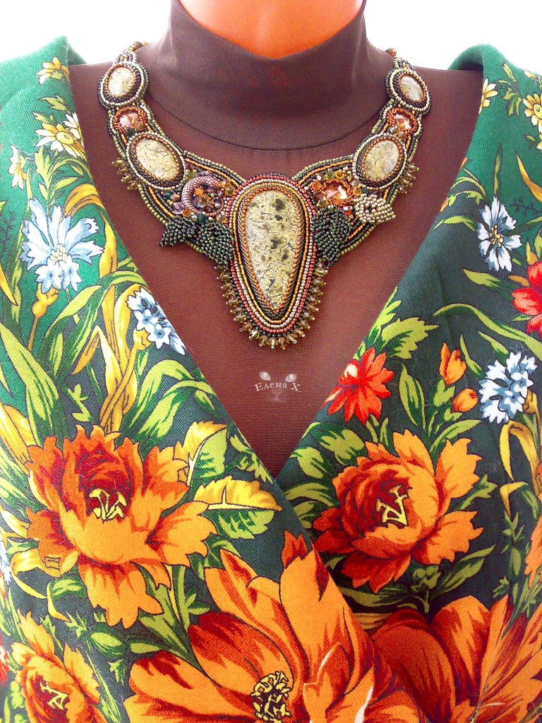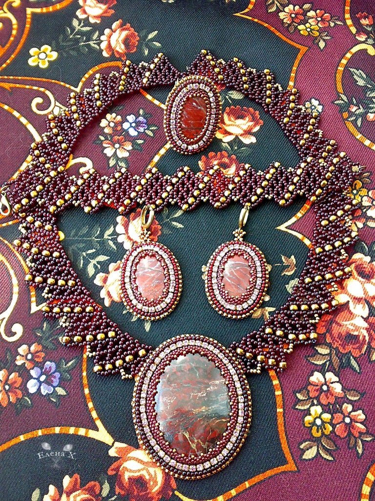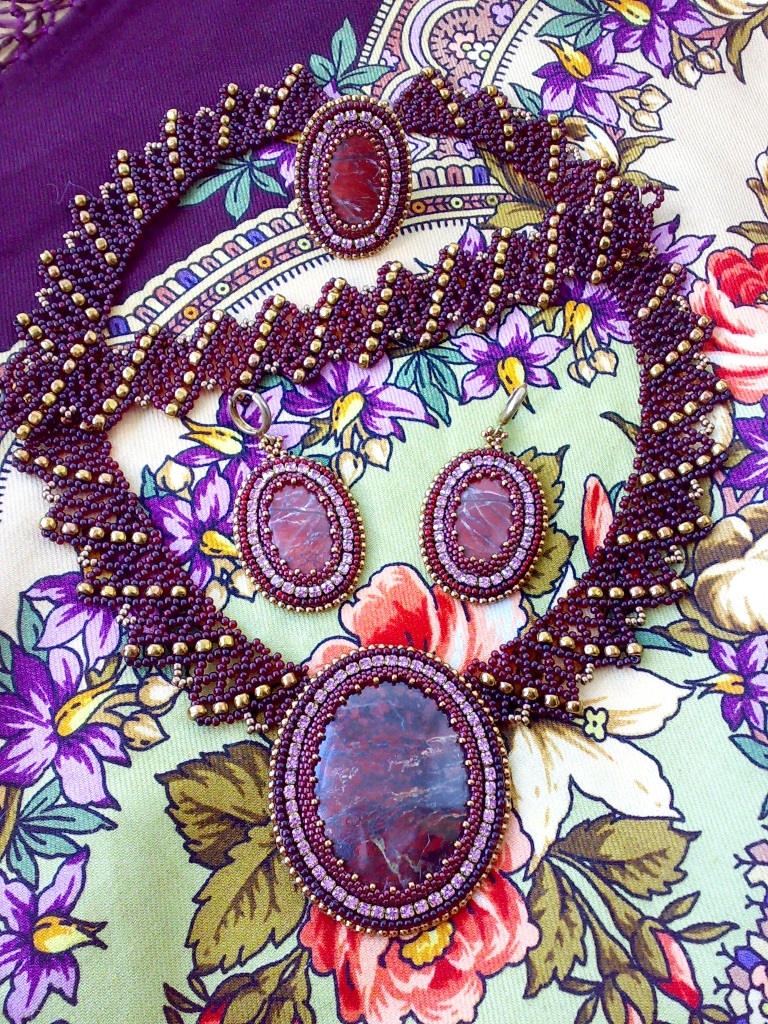 Этот комплект был сделан еще в феврале, под мои любимые Качели. Но как оказалось, комплект так же подошел и к шали У самовара 1 (правда этой шалочки уже нет). Вставки из уральского змеевика, Волжского симбирцита и нефрита.