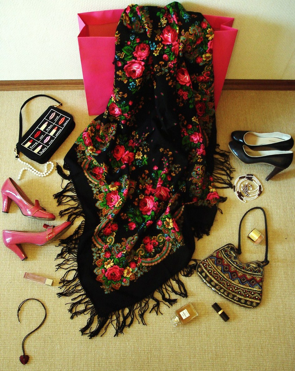 Здравствуйте! В данный момент я осваиваю просторы чужой страны, все мое богатство -- в чемодане, и в нем же, конечно, павлопосадский платок. Но даже в пустом гостиничном номере я умудряюсь впасть в ступор от вопроса, что же надеть))