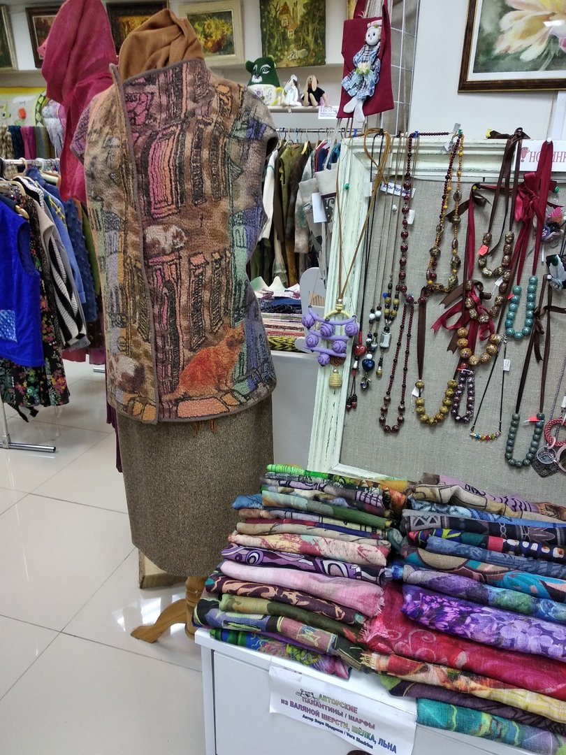 Захожу в местный рукодельный магазин. Бросилось в глаза сиренево- розовые цветы. В голове закрутилось "что то знакомое". О! Знакомые киски на палантине. Но почему авторство другое? И ни одной этикетки ни на каком палантине?