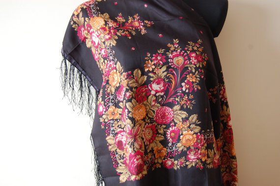 а я получила свои "цветы под снегом", (Кликните, чтобы почитать, что спрятано под катом).... Что сказать... ткань приятная, но что синтетика - совершенно точно, цвета прекрасные, но размер 120 х 120 простора воображению не дает. Кисточки негустые, но симпатичные, но сам платок обработан оверлоком и очень плохо обработан :( Купила только из-за цвета и чудесного рисунка, а колорит моих цветов очень даже симпатичный и к названию вполне идет :)