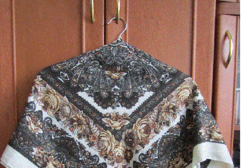 Здравствуйте! Решилась внести свою лепту. Размещаю фотографию платка (подделки), с которого, собственно говоря, началось мое увлечение павловопосадскими платками. Промозглой осенью мне вдруг захотелось иметь теплый платок. Продавщица, уговаривая меня купить этот платок, горячо убеждала, что он настоящий. Поддалась уговорам и купила, а дома нашла в интернете сайт настоящих платков и все поняла. Не сразу разглядела рисунок , пока не сфотографировала. Качество фотографии плохое, но рисунок разглядеть можно.