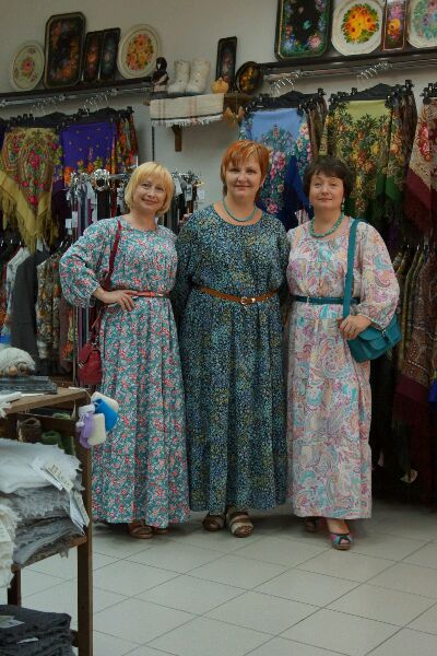По секрету мне сказала МэриКэт, где есть платья подобного кроя русского. Отличается он тем, что все платье сшито из прямоугольников. В принципе, сшить нетрудно. Но для того, чтобы оно получилось и длинным, и летящим , необходимо метра 3,5-4 подходящей ткани. Я сначала батист рассматривала. Но нет! Он тонкий, дышащий, но не такой пластичный, как надо бы. Да и торчит он, то есть жесткость должа быть еще меньше. Современные вискозные плательные ткани - как раз то, что надо! Выбор их в магазине очень разнообразен. И даже можно подобрать потоньше-потолще. И я выбрала. И купила 4 метра. А тут Маша с информацией... В общем, купила я сегодня еще одно подобное платье! В любимом нашем магазинчике в БУМе. Подкупила и цена, и множество расцветок. Так увлеклась, меряя, что еле выбрала. И ушла в нем. Жара абсолютно не чувствовалась, ветер гулял под платьем, а я шла гордая, выпрямив само по себе спину, подняв голову и став будто выше... Пошла фотографироваться!