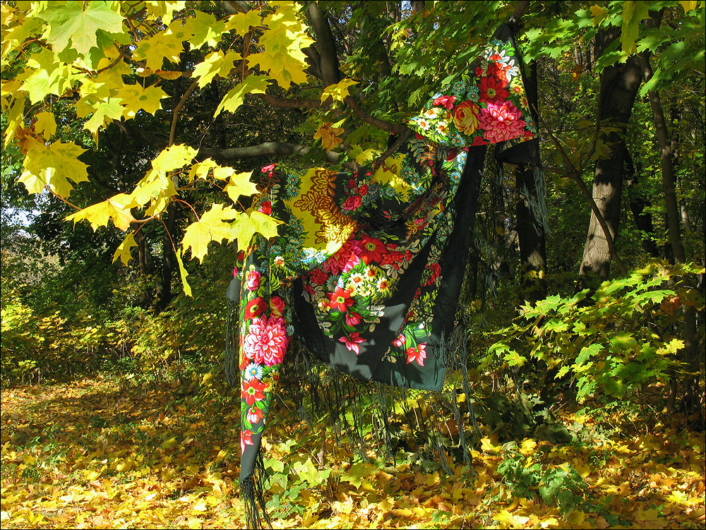 Я не стала создавать осенние композиции - просто бродила по лесу и высматривала такую натуру, которая без каких-либо усилий с моей стороны ПРИНЯЛА бы шаль: так, чтобы они стали чем-то единым, целостным. Когда это удавалось, возникало особое чувство радости - почти что счастья: красота шали и великолепие леса в осеннем убранстве... Вот эту радость я и хотела подарить тем, кто увидит мои снимки.