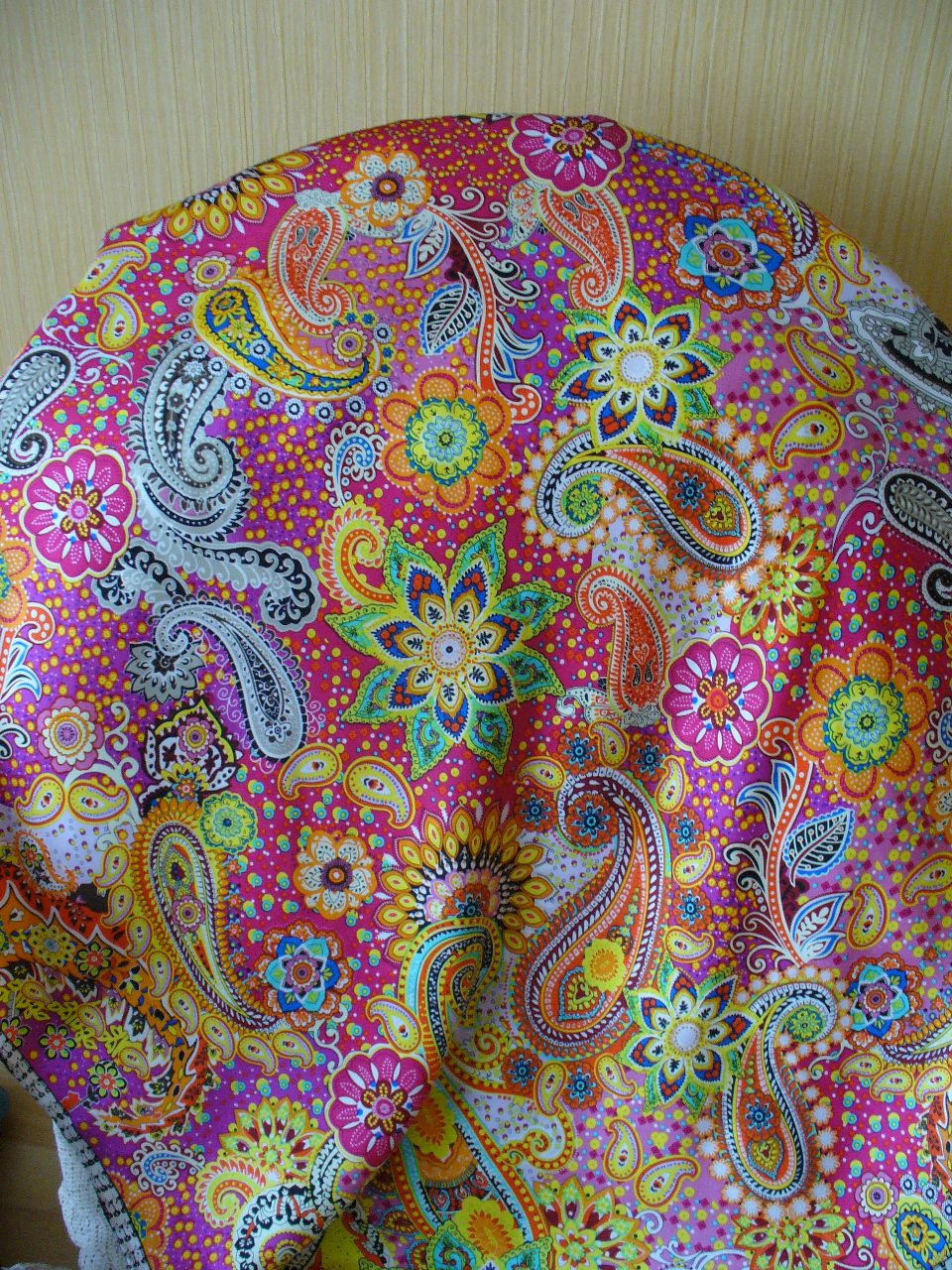 Италия шпарит в духе павлово-посадской Татьяны. Пишут, что под Этро. Шелк 90х90. Мне показалось интересным, что огурцы заходят на полосатую кайму.