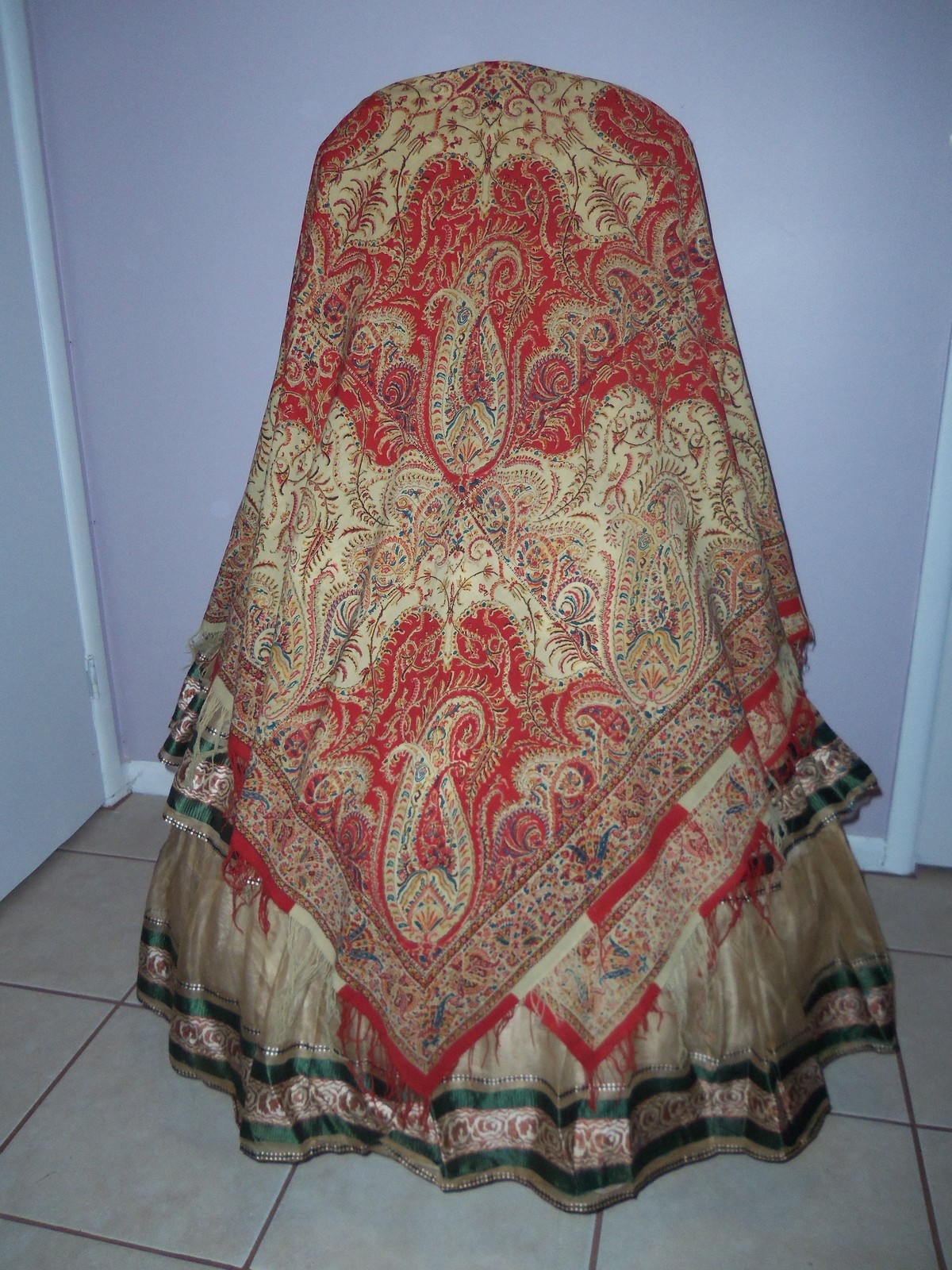 "Эта шерстяная шаль с бахромой, ранней античной викторианской эпохи, датируется 1850-м годом. Она изготовлена из мягкой облегченный Кашмирской шерсти с плетением drawloom (длинной шерстью?), с кремовым цветом фона, с красочными розовыми и голубыми натуральными красителями. Есть кремовая шерстяная бахрома вокруг всей шали. Эти первые шали были сделаны в Норвиче (Англия) и Пейсли (Шотландия), дизайн рисунка взяты из шали в Индии и Кашмире. Этот потрясающий платок размером 60 на 60 дюймов (152 см).