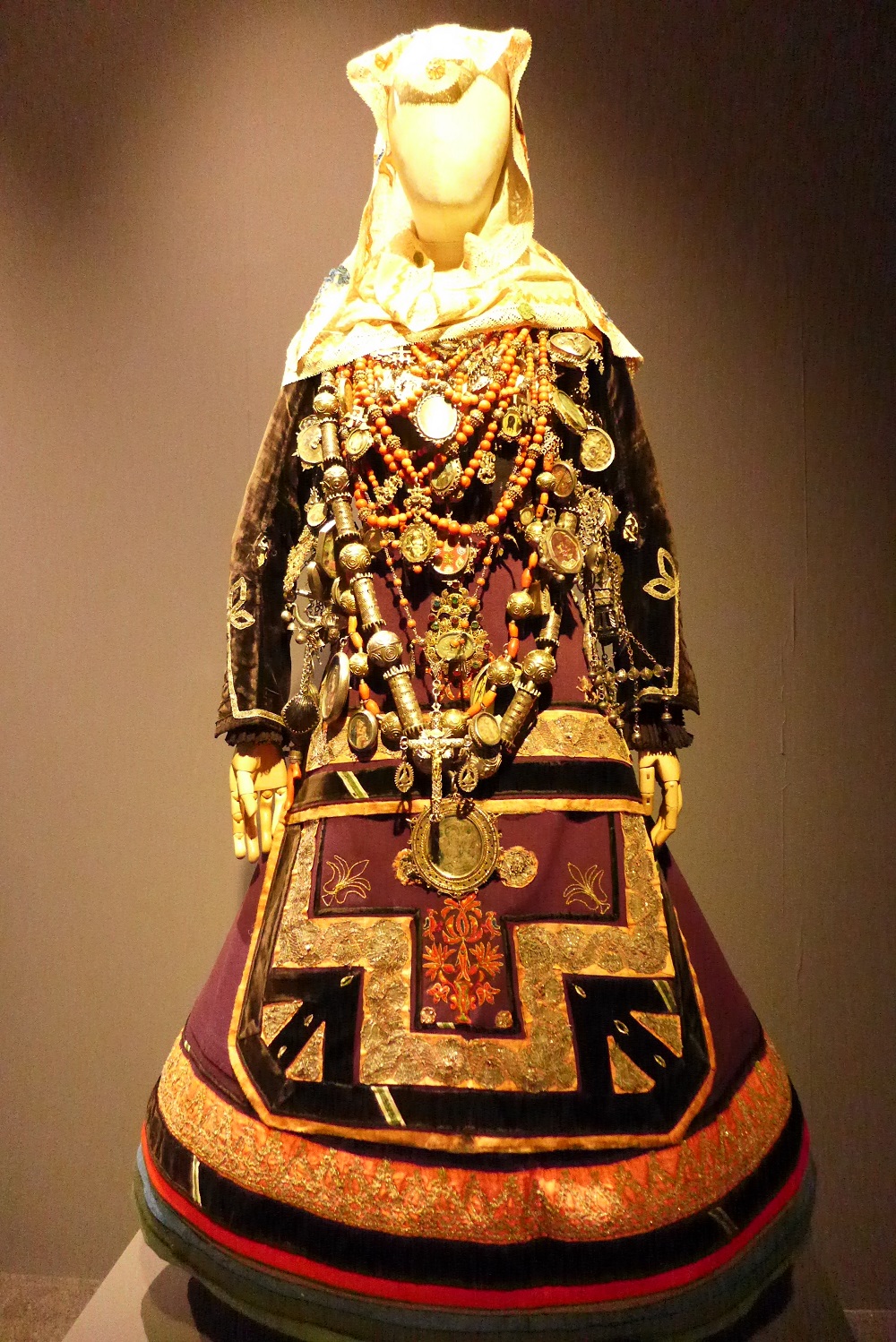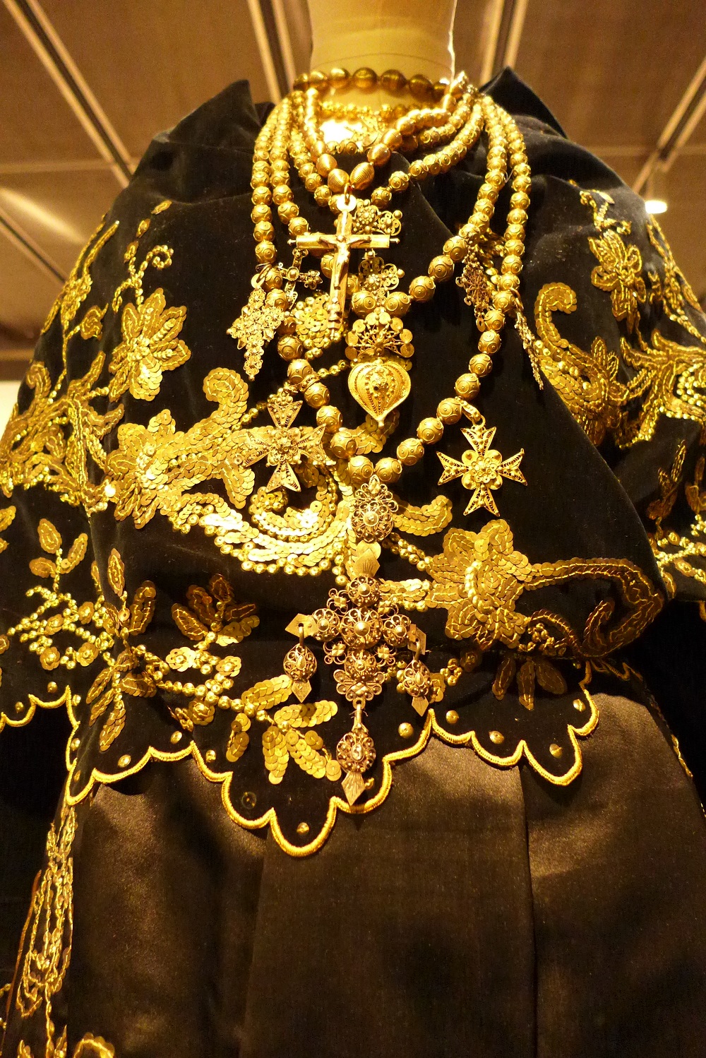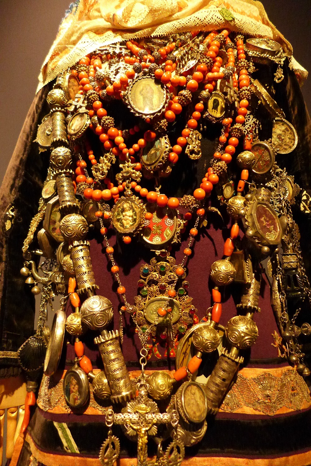 Свадебный костюм. Провинция Salamanca. Такое количество украшений (реликарии, обереги, кресты) - демонстрация богатства и статуса семьи. Иногда вес может достигать 10 кг.