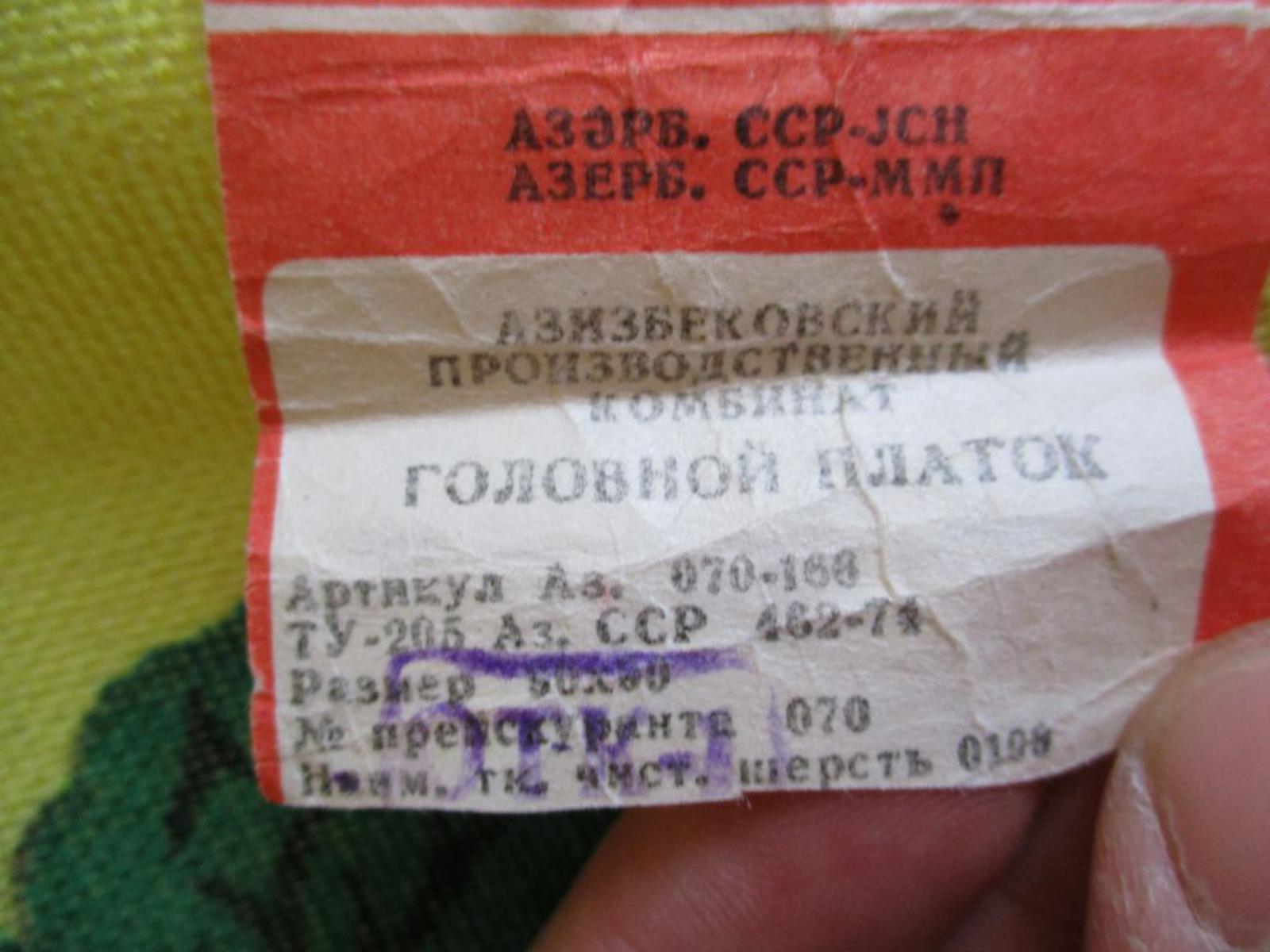Этот платочек в каталоге не нашла, этикетка к нему пришита ниткой, на этикетке: г. Сумгаит, май 1988г., размер 73 на 73