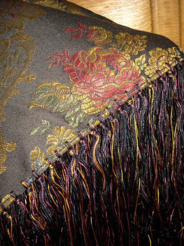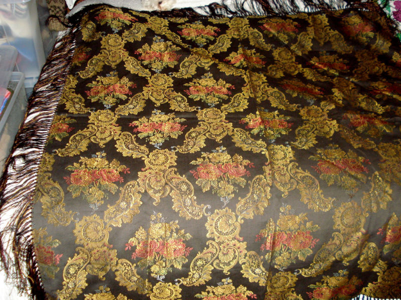 Веселенькая скатерка! На самом деле, я часто вижу в интернете шали, которые из-за гигантских размеров довольно трудно отличить от скатертей (и наоборот). Особенно это относится к вышитому шелку и жаккардовым вещицам... Думаю (судя по дефектам), иногда их так и использовали, на столах.