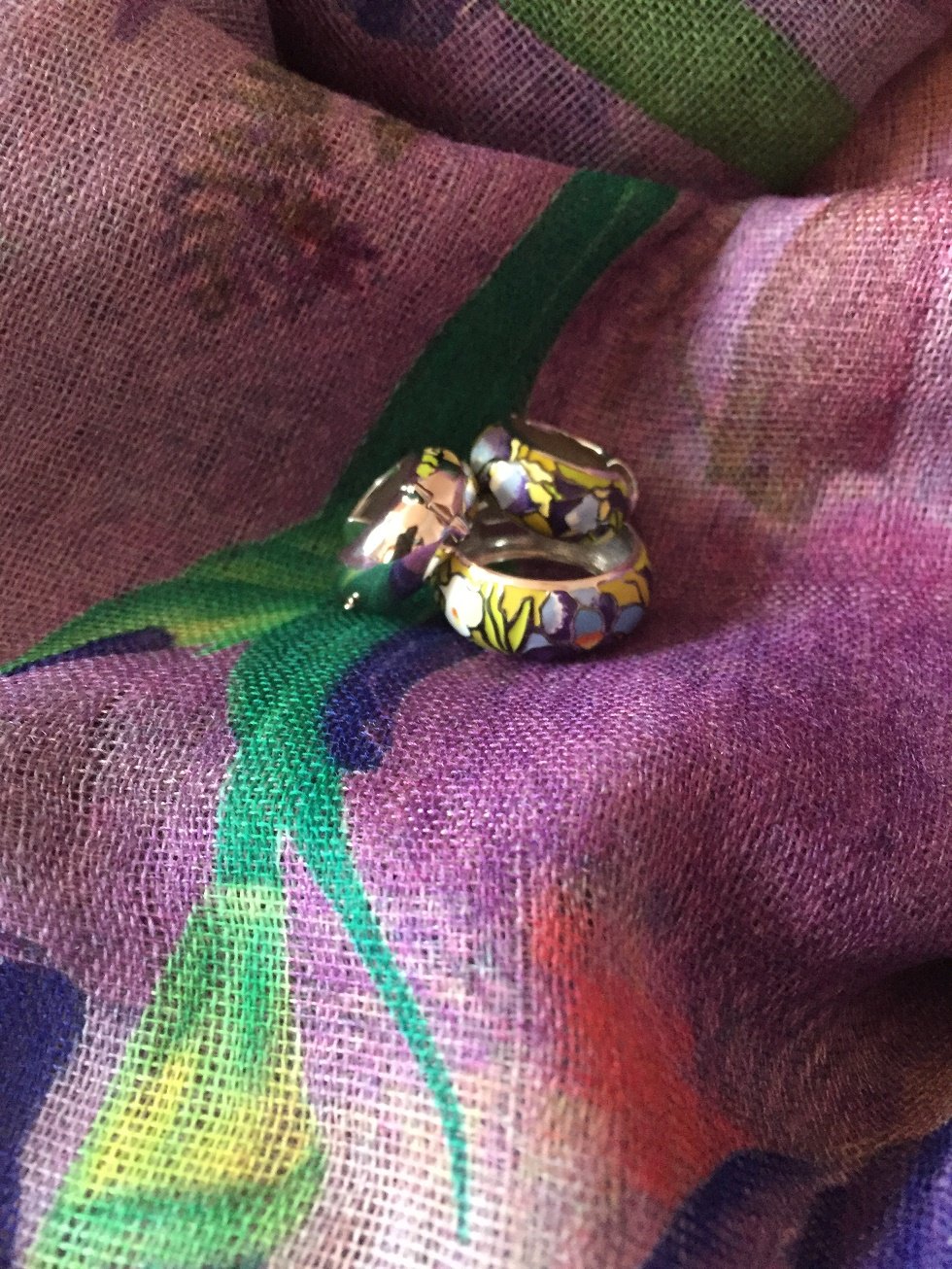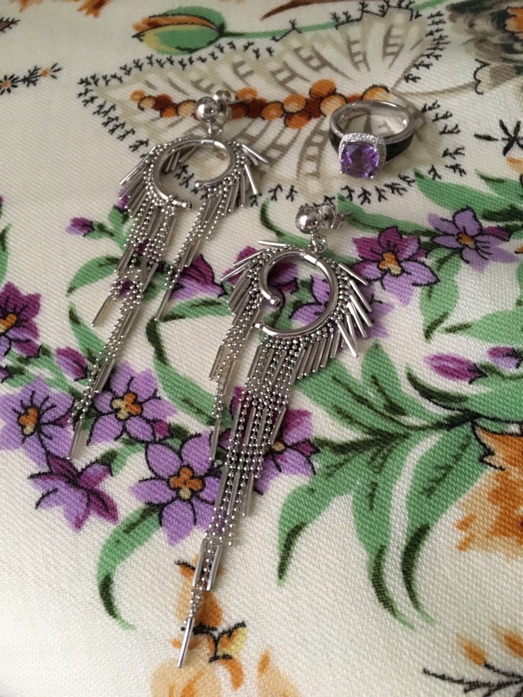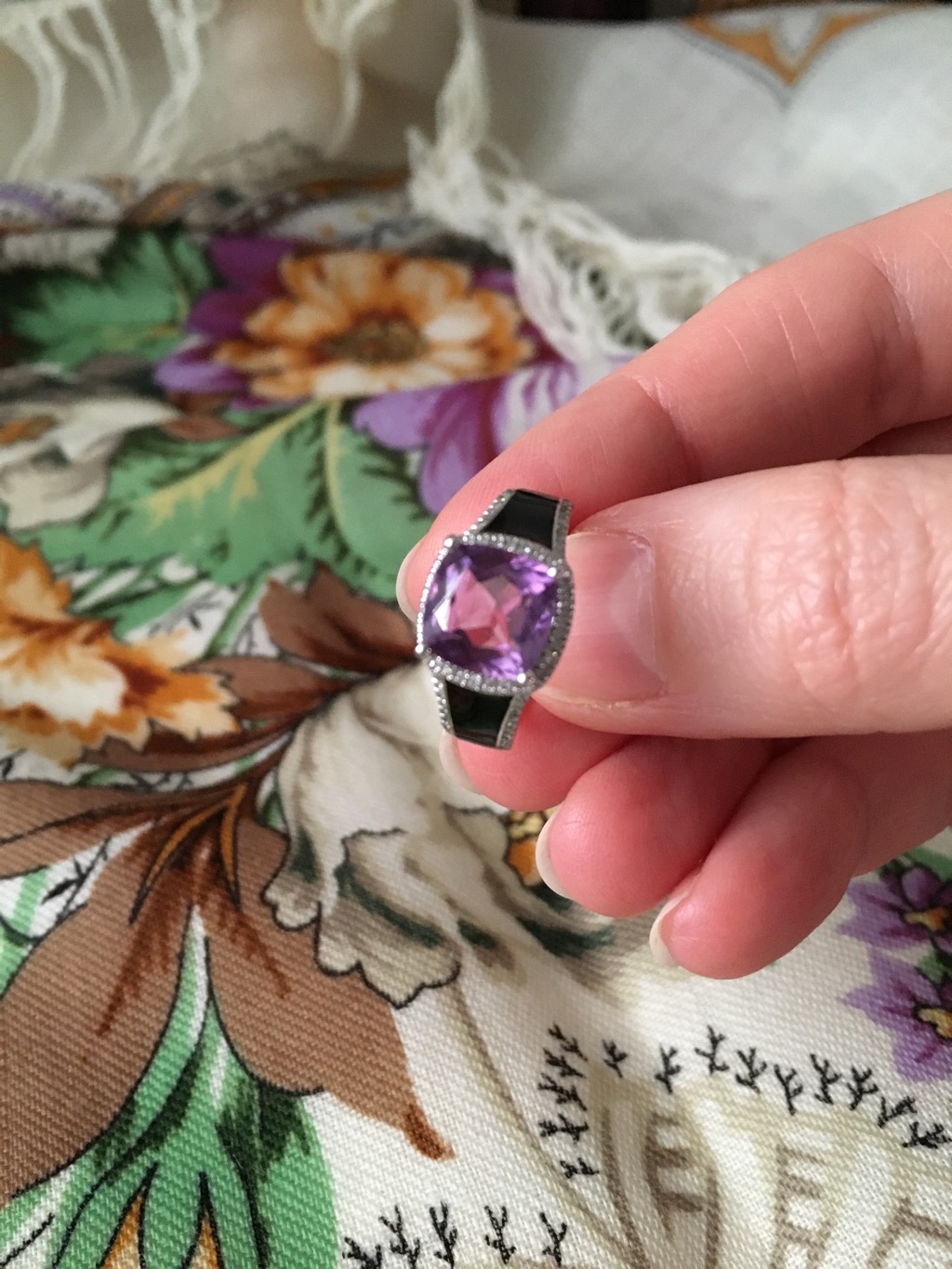 Я тоже носила Отраду на этой неделе. Покажу на ней новенькие украшения, хотя по стилю они ей не подходят. Купила кольцо из белого золота с аметистом, бриллиантиками и чёрной эмалью. И ещё серебряные сережки интересного дизайна. И их можно носить вместе с кольцом!