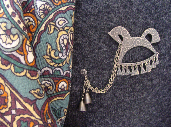 Две броши из более вменяемого возраста. Носила из лет в 25 - 30. С однотонными кофточками и платочками. Теперь надо категорически пересмотреть свой нынешний цветастый гардероб и вернуться к однотонным вещам. Раз платочное увлечение так накрыло. Глядишь, и броши все вытащу из запасников