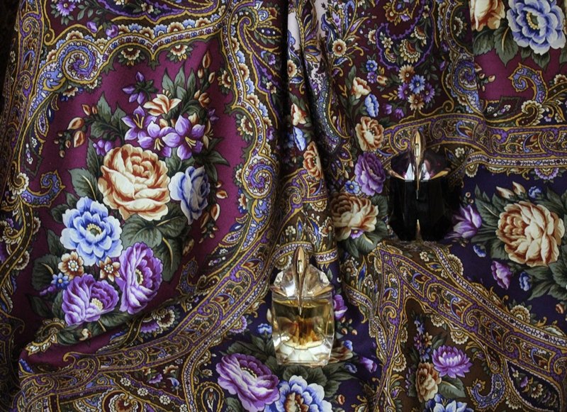 В парфюмерных ароматах не разбираюсь(Кликните, чтобы почитать, что спрятано под катом)..., но до чего же некоторые флаконы к рисункам и колоритам платков подходят