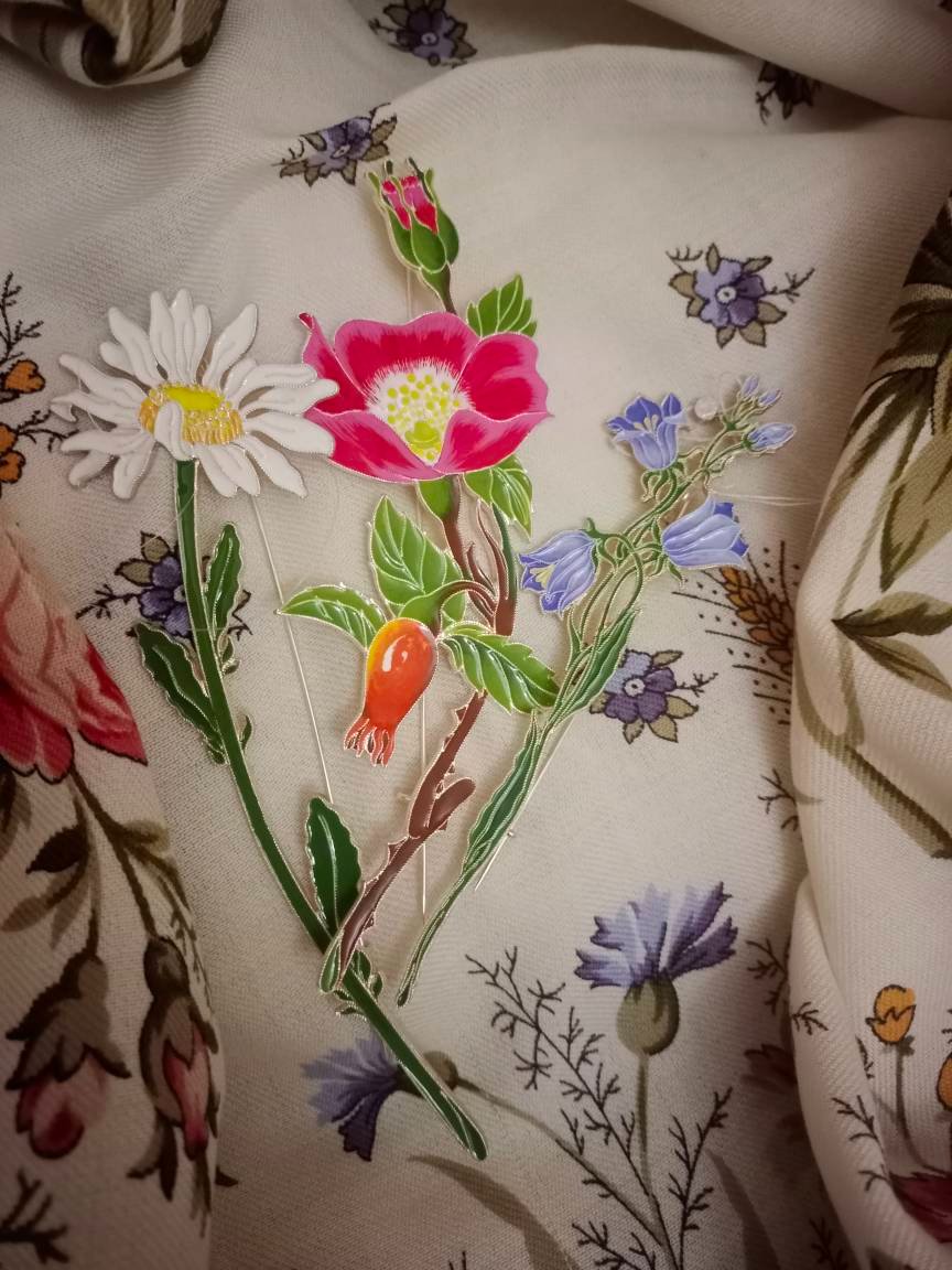 "Утренний сад" вид 2 Клары Зиновьевой( шерсть 135-135) и букет от Русских Самоцветов - броши из коллекции Татьяны Поляковой -" Шиповник", "Ромашка", "Колокольчик". Серебро, эмаль.