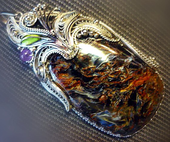 Вот мой кулончик, подойдет под многое, в нем петерсит, лабрадор, раух, зеленый аметист, голубой топаз и жемчуг бива
