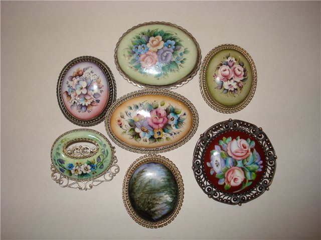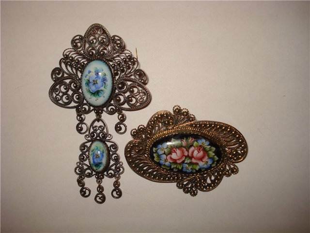 ПростоНастя - Ваш кулон - это Ростовская финифть, начало 70-х годов. Называется "Утро". Такую и брошь делали. А серьги - это костромская финифть из села Красное, тоже этих же времен. А такую шкатулочку-брошь моя сестра покупала во второй половине 90-х на Вернисаже в Измайлово