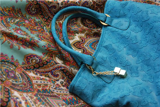 Привезли мне сумку, она оказалась совсем не большой, среднего размера в общем, цвет не самой яркой и светлой бирюзы, но фот отказывается этот цвет воспроизвести правильно, а в реале идеальное попадание под шаль ВУ1, ну, и остальные платки