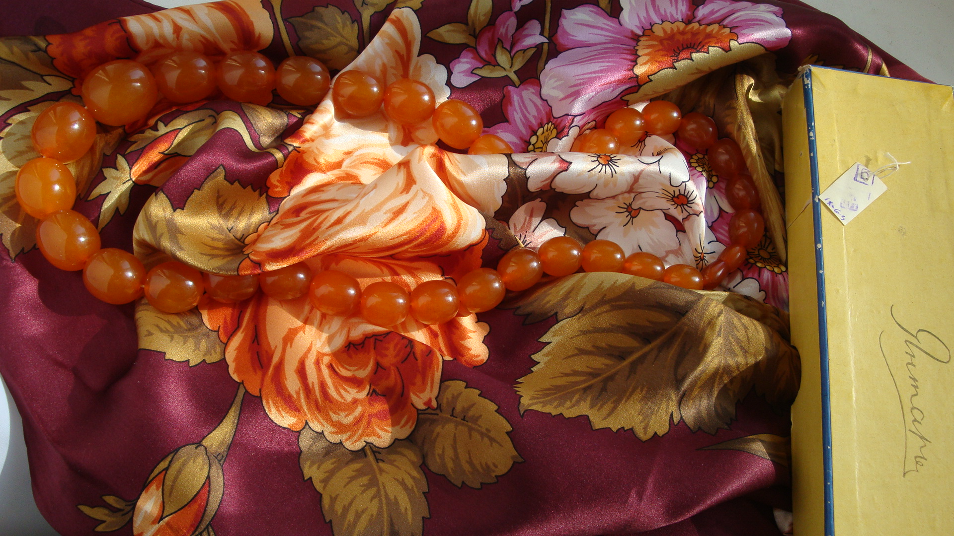 Я хочу показать один раритет - янтарные бусы 1963 года. Не знаю, буду ли их носить,но они шикарные. Крупные, тяжелые, сочные! "Свела" их с платком "Итальянский полдень",потому что его сейчас ношу. Получилось,что есть много общего в оттенках.