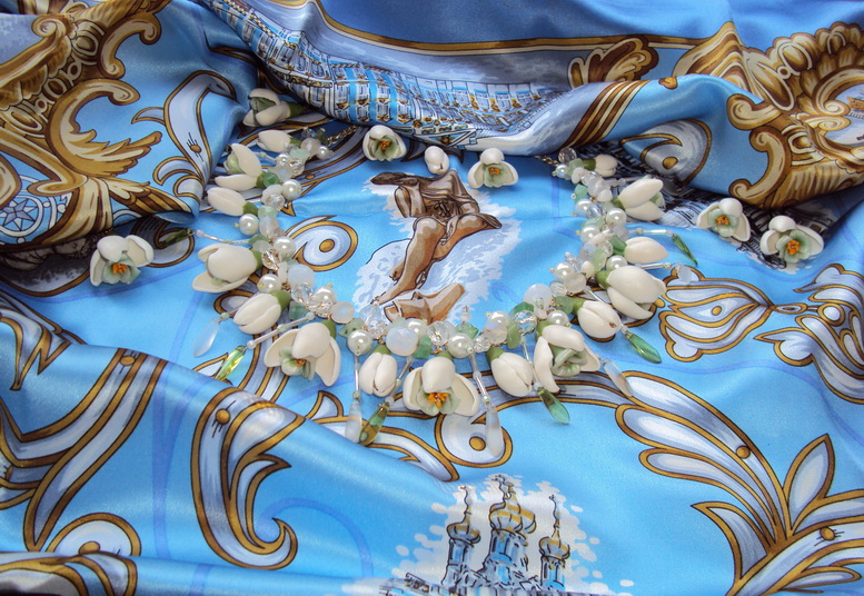 И, как исстари говорится на Руси: «раз пошла такая пьянка, режь последний огурец», - раз начала показывать платочки из серии «Города», то буду последовательна. Покажу сочетания оставшихся двух с произведениями одной замечательной мастерицы-искусницы, сейчас проживающей во Франции. Ксюша работает с полимерной глиной (последняя, если мне не изменяет память, ещё не была представлена на этих страницах, а ведь данный материал предоставляет широчайшие возможности для творческого самовыражения); и так как в плюс с прекрасными человеческими качествами Ксюшенька ещё и моя близкая подруга, то я доподлинно знаю, сколько труда, мыслей, сил, души и времени она вкладывает в авторскую разработку своих эскизов и кропотливую сборку всех вылепленных элементов и узоров задуманного комплекта, чтобы её Бижу было таковым на деле и носилось с удовольствием – что и происходит на практике