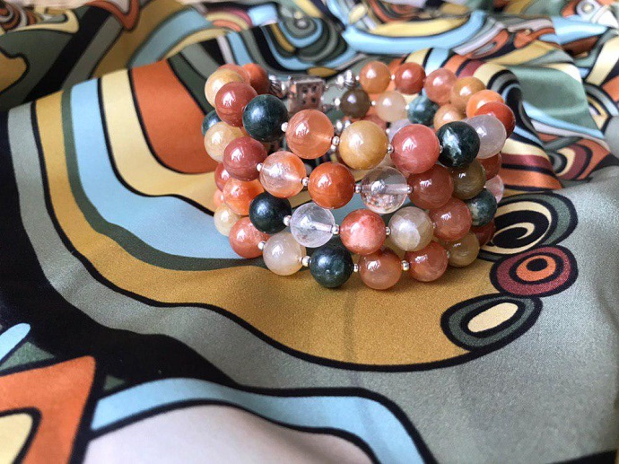 Платочек такой имею. Облизнулась на браслет, а фантазия уж потекла дальше: я бы попробовала в таком исполнении чокер. Тоже четырехрядный, но вместо застежки платок "Солнечный город". Можно завязать хоть сзади, хоть сбоку...