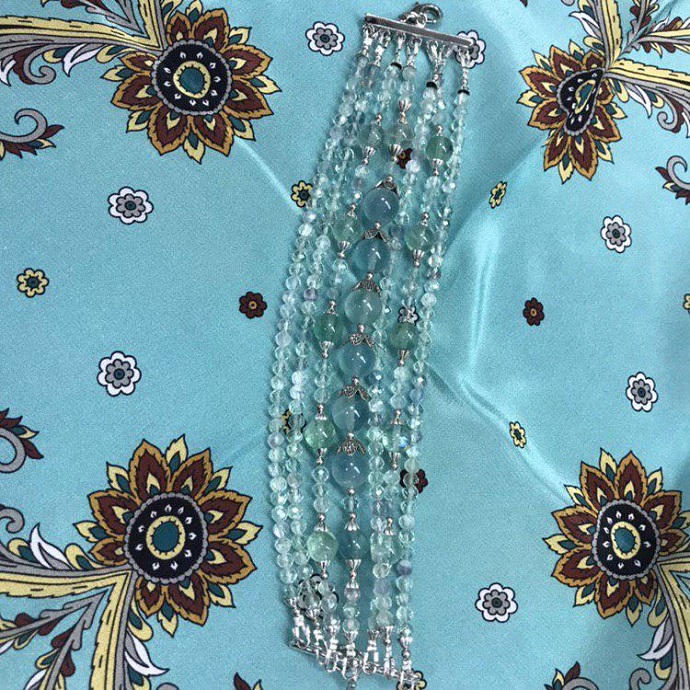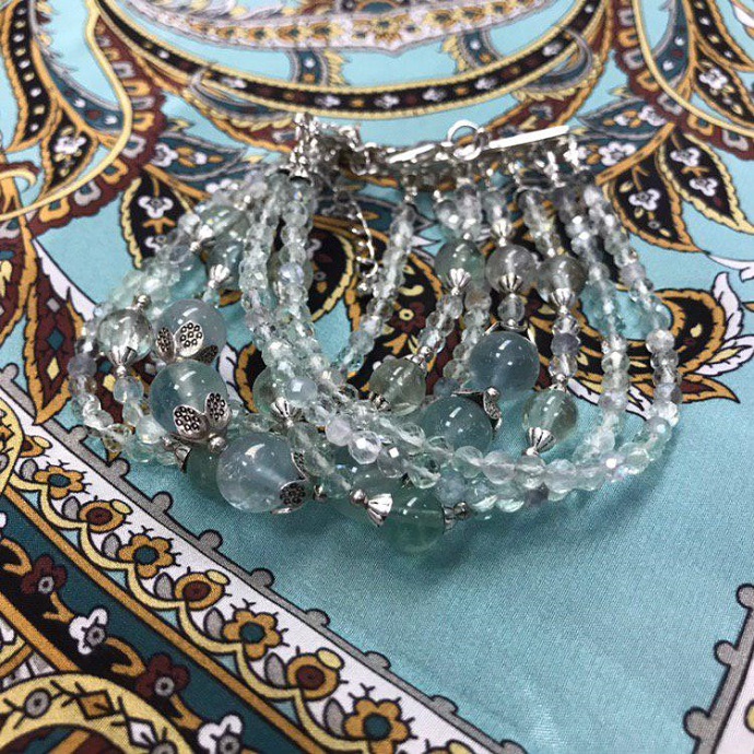 Коралловый бриз Елены Жуковой из тех платочков, на которые я могу смотреть долго-долго, как на море. В 11-м колорите невероятно нежный, воздушный. К этой дивной, зеленоватой бирюзе подошли флюориты. Выбирала только зеленоватые камешки.