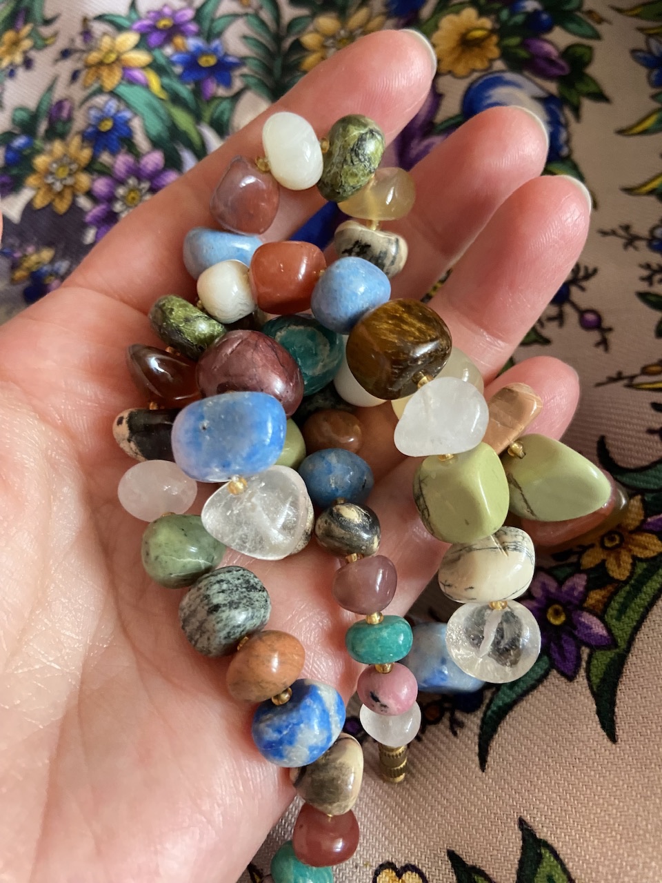 Галина, спасибо за отклик на мое сообщение. Мое недавнее приобретение. Колье из аквамарина, розового кварца, горного хрусталя и гематита. Удачное сочетание минералов, подходит практически к любому наряду и платку.
