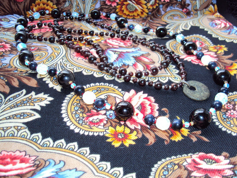 И, в дополнение, покажу свои гранаты, которые по своему характеру напоминают мне "В лунном свете 19". К сплетённым мною пару лет назад небольшим бусам я подобрала археологическую подвеску, которая в те давние времена была сделана из старинной монеты.