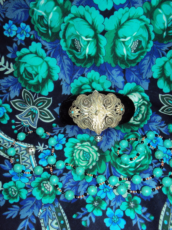 Раз пошла речь о бирюзе, которую действительно трудно найти, решила показать вам, девоньки, свою "Русскую красавицу 14" (Скань) и старинную русскую скань с двумя "горошинками" бирюзы, а также довоенное колечко с бирюзой (примерно такого же размера, как и в заколке).