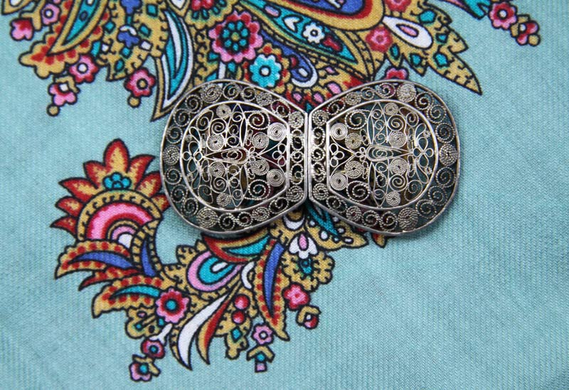 С учётом, что Вы носите каре, а также увидев симметричную пряжку тонкой работы, с надёжным зацепом, оценив примерно размеры, предполагаю, что в каждый из двух её проёмов пройдёт по небольшому уголку тонкого шерстяного (а скорее, только шёлкового либо батистового) платочка без бахромы. Если платок светлый, нужно тщательно следить, чтобы дужки пряжки не увлажнялись, так как может произойти окисление металла и ткань испачкается (тонкий слой прозрачного лака для ногтей с внутренней стороны пряжки, вероятно, предохранит от такой неприятности). Итак, концы платочка протягиваются в проёмы, а затем симметрично выводятся вниз, как нижние крылья бабочки.