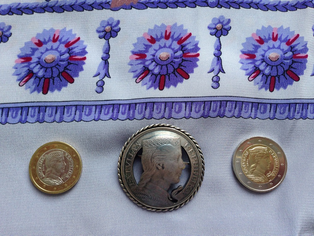 С этого года Латвия перешла на евро. Мне очень понравился рисунок монеты, девушка в латышском национальном костюме. А этим летом, будучи в Риге и зайдя в сувенирный магазин, увидела брошь. Продавец рассказала, что она сделана в виде точной копии монеты в 5 лат 1931 года. В общем и евро и брошь - это копия старой монеты.