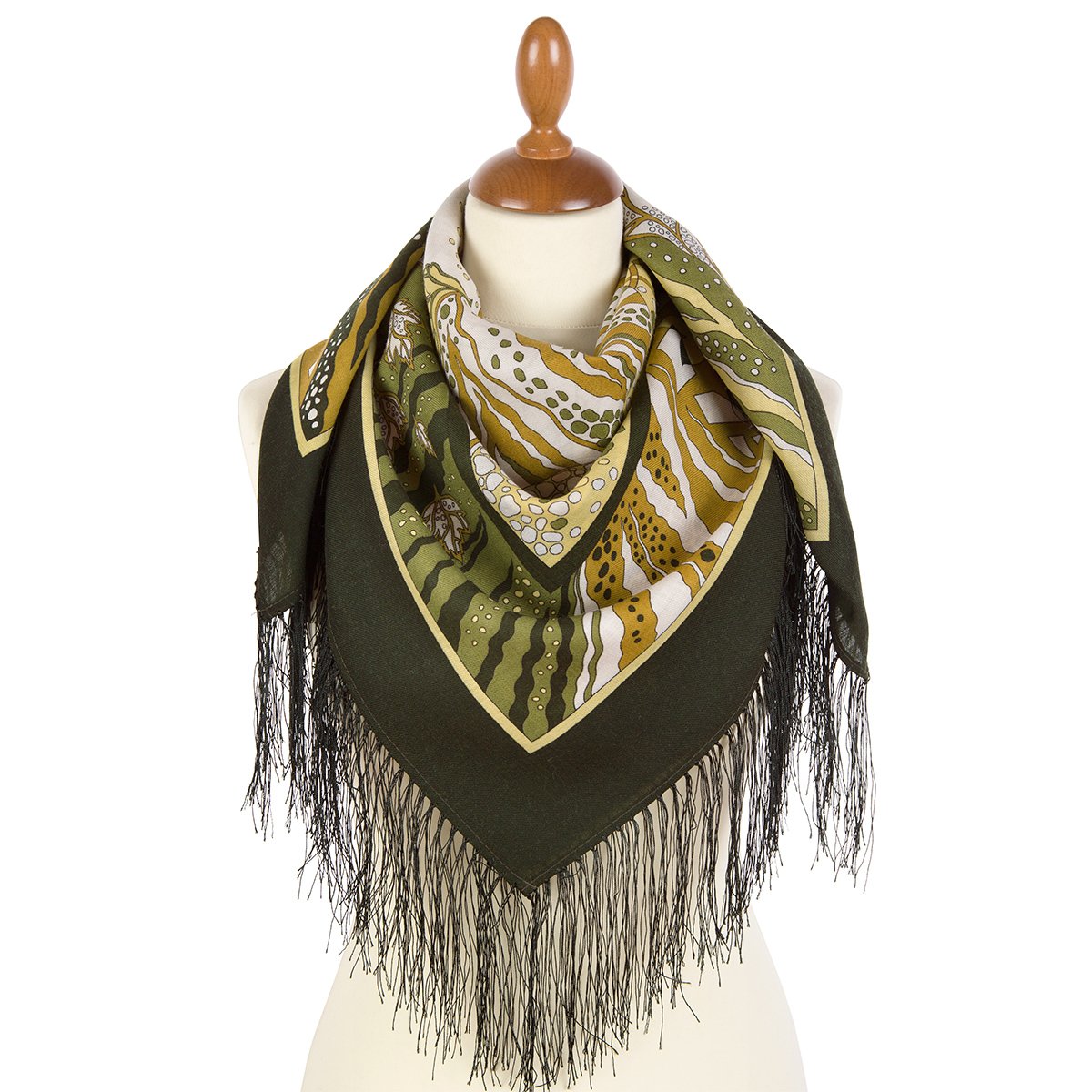 903-10 Кайма платка темно-оливковая. В рисунке присутствуют бежевые, золотистые, оливковые и серые тона.