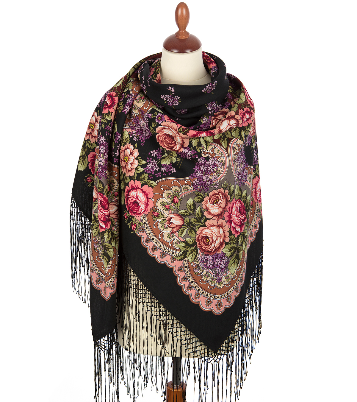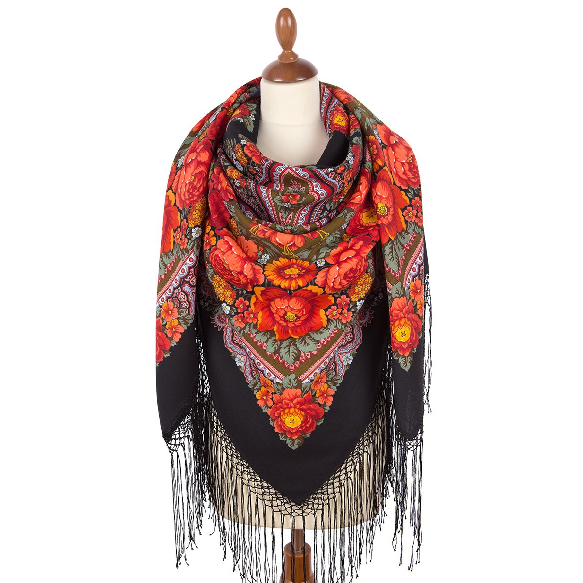 Платок из уплотненной шерстяной ткани с шелковой бахромой, 148х148см.
