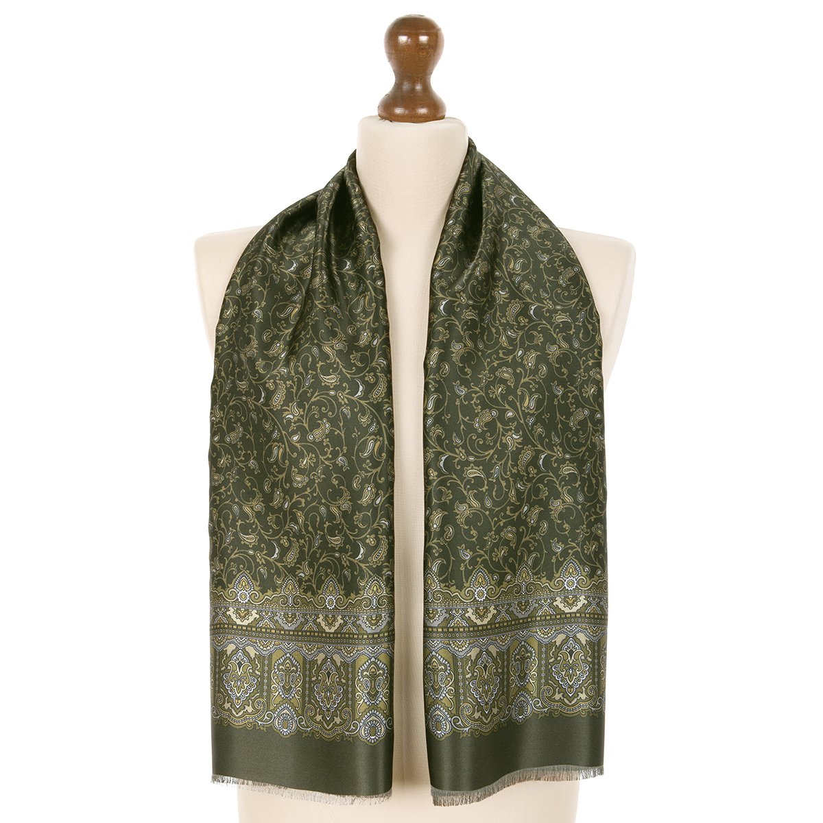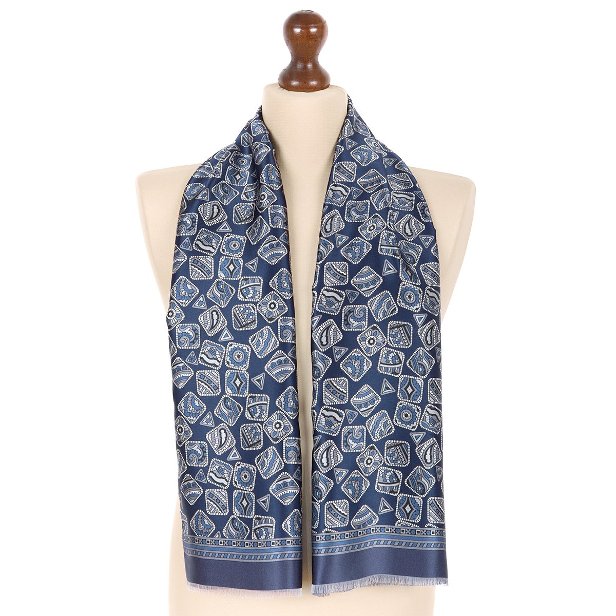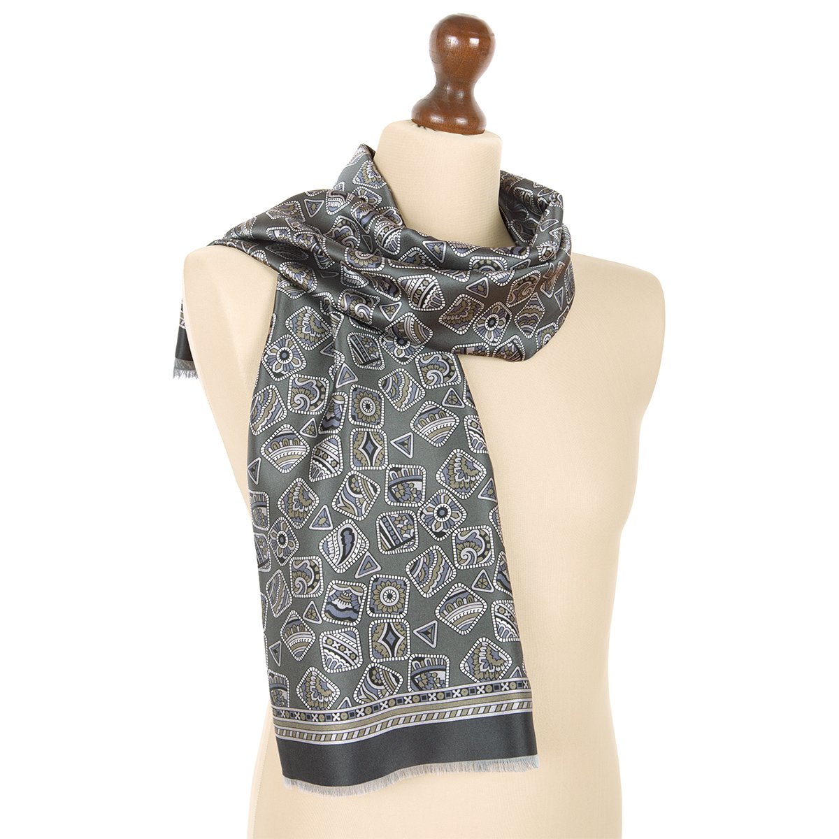Кашне изготовлены из двух сшитых между собой по длинным сторонам частей — лицевой — из набивного шелка (атласа), и изнаночной — из гладкокрашеной шерсти. По узкой стороне — осыпка. Изделие сочетает в себе нарядный вид шелкового шарфа с теплом шерстяного кашне.