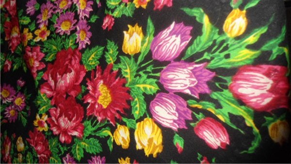 Шаль 150х150 с круговым цветочным мотивом с букетами тюльпанов и русским резным орнаментом