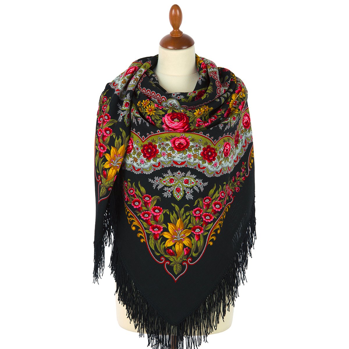 Шаль 150х150 с крупными букетами по углам и ажурным веночком из листьев каштана в среднике