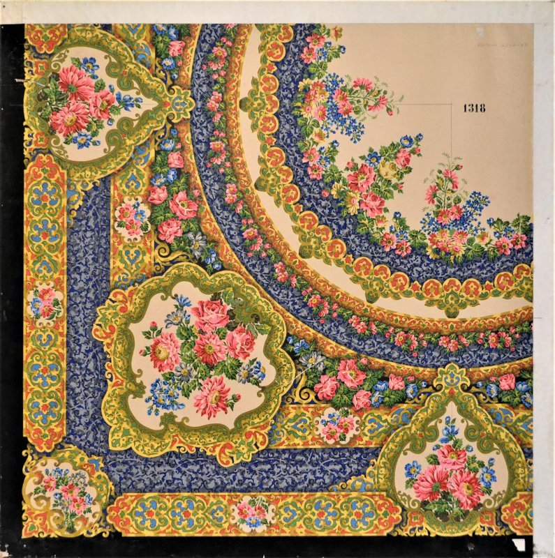 Эскиз рисунка составлен на черном фоне из ярких розовых пионов и сгруппированных мелких сиреневых цветов, дополненных желтыми лютиками. Особенно выделена угловая часть. Центральное поле заполнено вразброс из отдельных цветков и маленьких цветочных композиций.