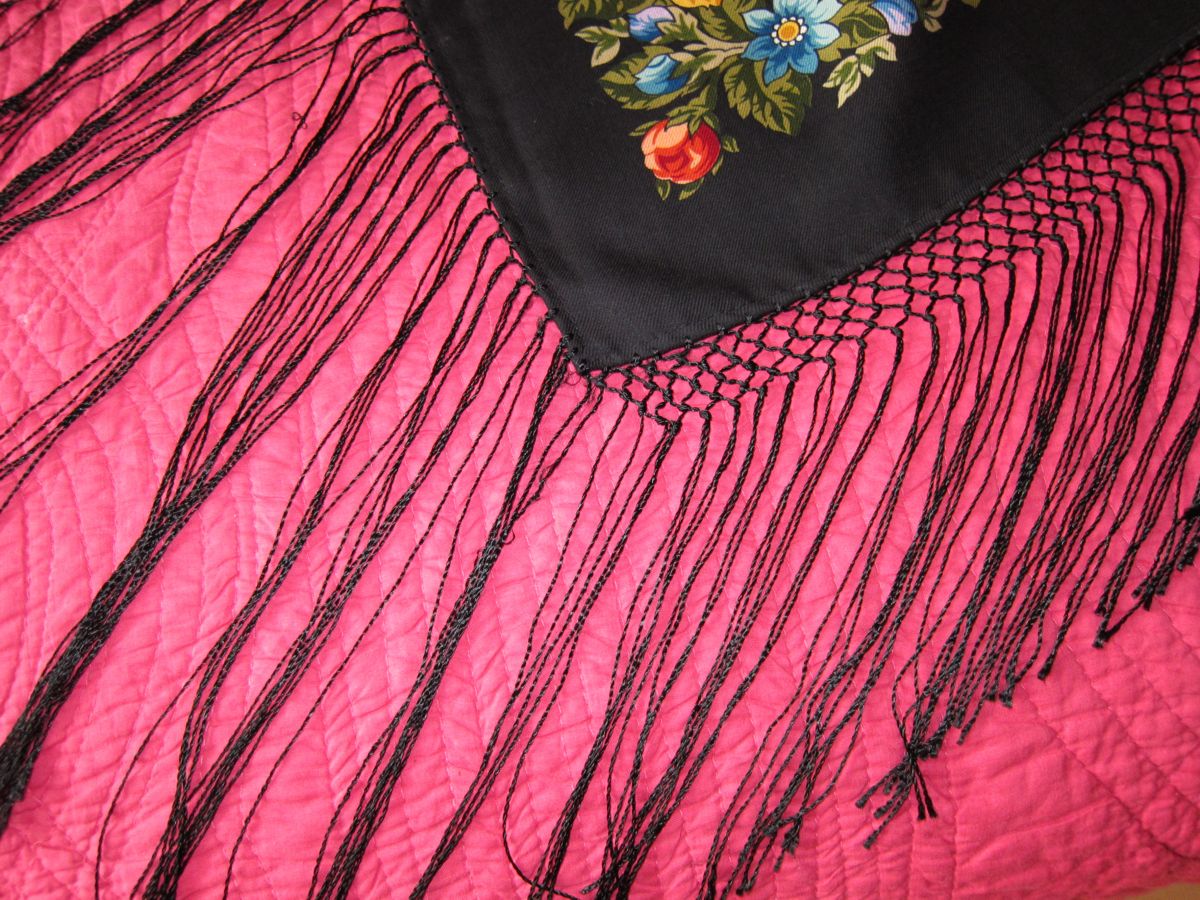 Некоторые рисунки на шелковых шалях, например, Первое свидание, просят бахрому. И платок лучше драпируется. Но выглядит она прилично в лучшем случае до первой стрирки, увы.